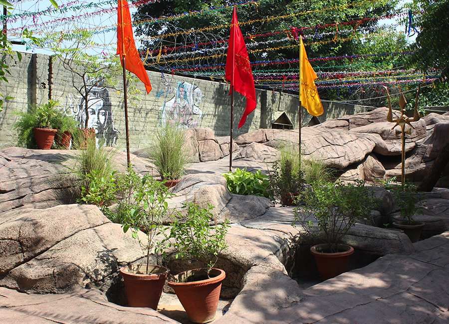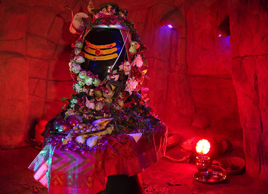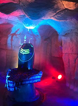 The Shiv Lok has lively forms of Lord Shiva painted on the walls leading to the altar. Two tridents, one at the beginning of the way leading to the Shiv Lok and the other behind the Shiv Lingam have been placed as a symbol representing the three aspects of Lord Shiva-Creator, Preserver and Destroyer.